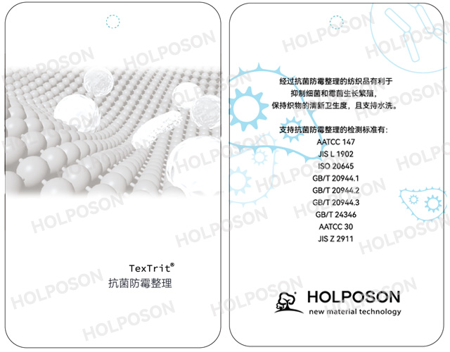 HOLPOSON® Captain AM 是一种具有抗菌、防霉和防螨多重作用的抗菌防霉整理剂,适用于大多数的纺织纤维,如:棉、毛、涤棉、锦纶、腈纶、粘胶、涤纶等天然、合成纤维及混纺织物。即可应用在针织物、梭织物、运动装、工作服、无菌行业服装 、家纺产品、装饰用布等纺织品。