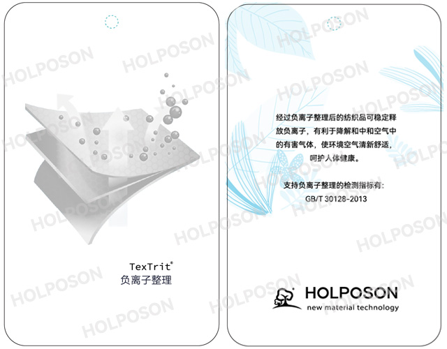 HOLPOSON® White Angel 适合用于各种纤维的后整理,整理品具有释放负离子功能,测试指标符合GB/T 20128-2013《纺织品 负离子发生量的检测和评价》标准。适用于中老年人群的:内衣、床品、墙布、地毯、桌布、围裙等。