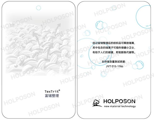 富锗整理剂HOLPOSON® GE是本公司采用微胶囊技术制成的功能型整理剂,后整理高温定型能使富锗整理剂HOLPOSON® GE牢固的结合在纺织品上,使其具有持久的释放功能。