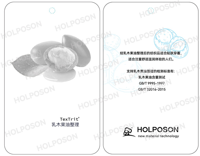 HOLPOSON® BODY SHEA BUTTER主要成分是从非洲乳木果中提炼所得的乳木果油原料,是本公司采用独特技术将乳木果油微胶囊化后制备而成的织物用后整理加工剂。乳木果油整理剂HOLPOSON® BODY SHEA BUTTER主要应用于:内衣,家纺、围巾、手套、袜子等贴肤纺织品。