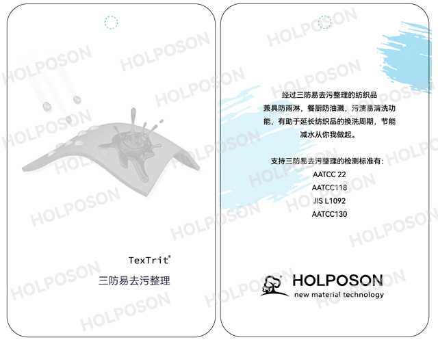 HOLPOSON® Smart Clean-T  亲水易去污整理剂 HOLPOSON® Smart Clean-T 是经过特殊改性聚酯类亲水易去污整理剂,能够赋予加工织物良好的亲水,抗静电,吸湿速干,蓬润性等性能,且耐洗性达50次以上(JIS L0217. 103法,连续洗涤法)经过易去污整理后的纺织品面料,在一定程度上可以清水擦除所沾污渍,如:酱油,番茄酱,玉米油,圆珠笔油污等。满足家庭主妇对浅色衣物易打理易清洁的要求。使难去除、易残留的脏污,可以去除干净,达到污所不落,节能去污。HOLPOSON® Smart Clean-T 适用于天然纤维、合成纤维及其混纺织物,目前易去污整理可用于开发浅色系列的童装面料,羽绒服面料,沙发面料,工装,职业装,衬衫,白T恤等等。