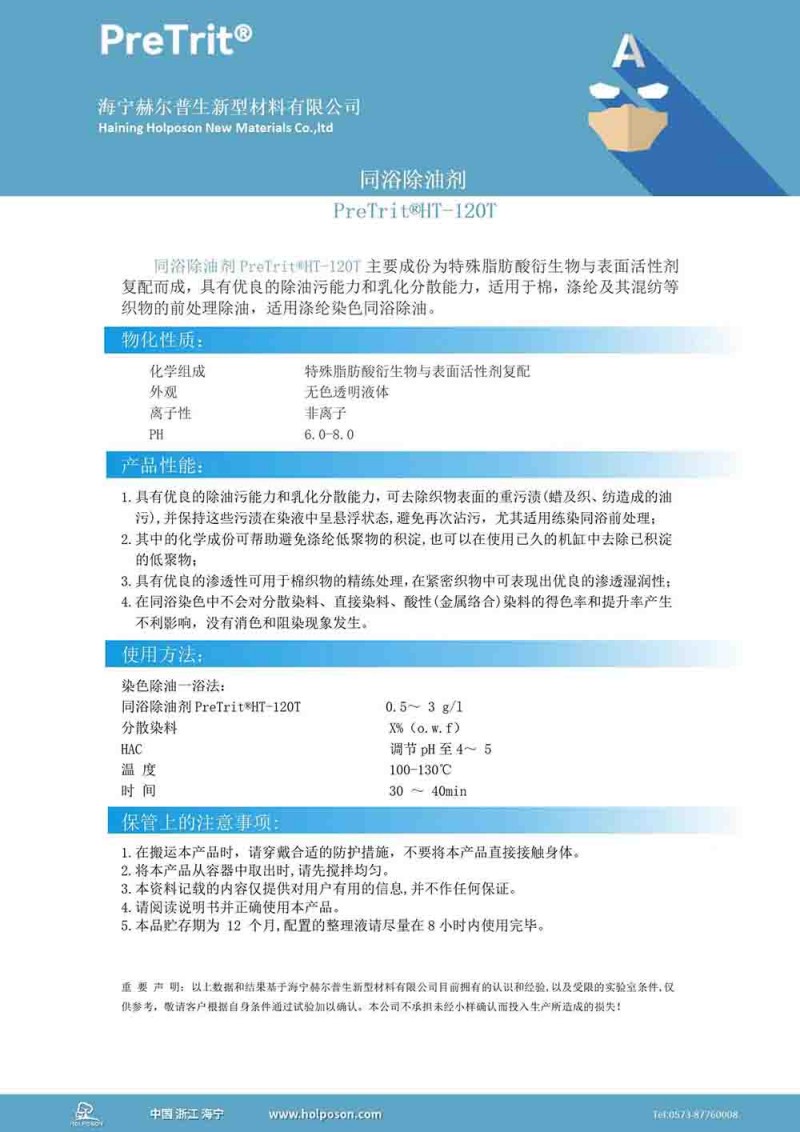 同浴除油剂PreTrit®HT-120T主要成份为特殊脂肪酸衍生物与表面活性剂复配而成,具有优异的除油污能力和乳化分散能力,适用于棉,涤纶及其混纺等织物的前处理除油,特别适用涤纶染色同浴除油。