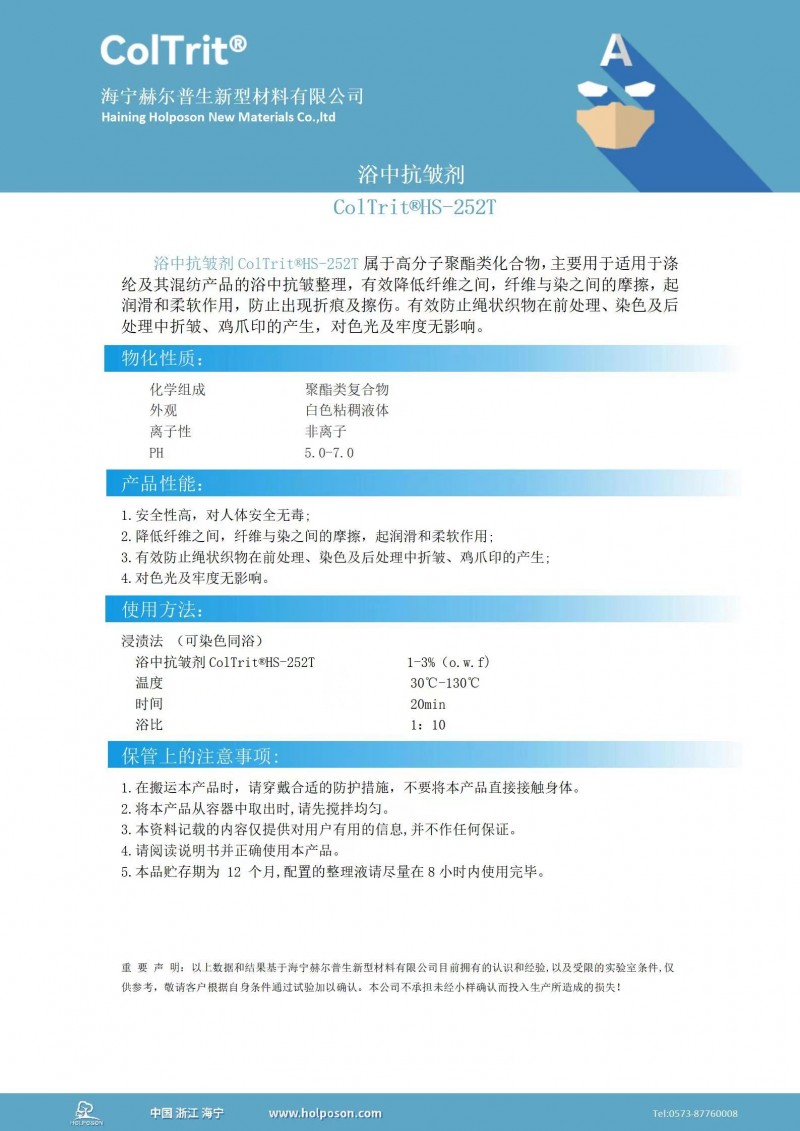 浴中抗皱剂ColTrit® HS-252T属于高分子聚酯类化合物,主要用于适用于涤纶及其混纺产品的浴中抗皱整理,有效降低纤维之间,纤维与染之间的摩擦,起润滑和柔软作用,防止出现折痕及擦伤。有效防止绳状织物在前处理、染色及后处理中折皱、鸡爪印的产生,对色光及牢度无影响。